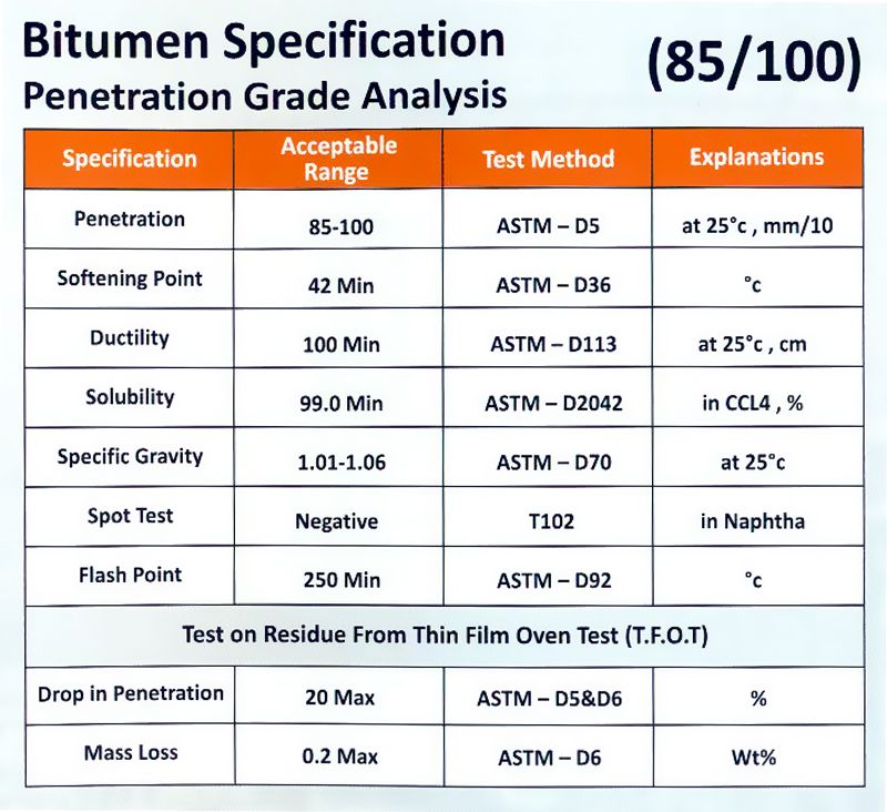 Penetration grade Bitumen is classified based on the penetration value as per ASTM D5-18 standards, ranging from very hard to very soft. The grades range from 10 to 500 penetration. Bitumen with a higher penetration grade is softer and more workable, making it suitable for use in warmer climates, while Bitumen with a lower penetration grade is harder and less workable, making it suitable for use in colder climates.
